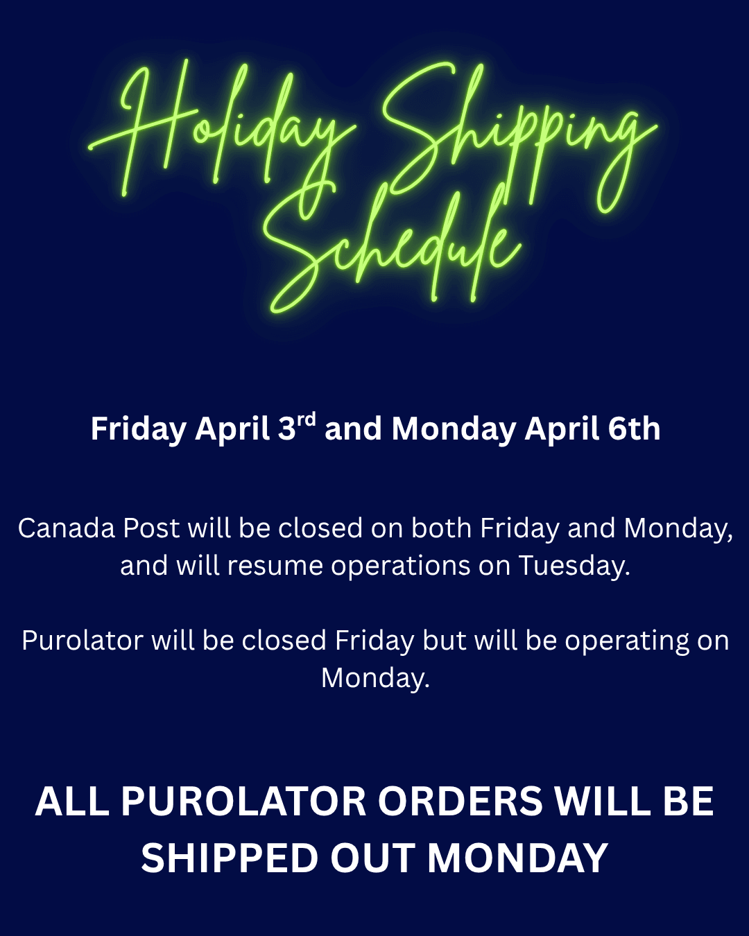 Purolator will be closed Friday but will be operating on Monday.
