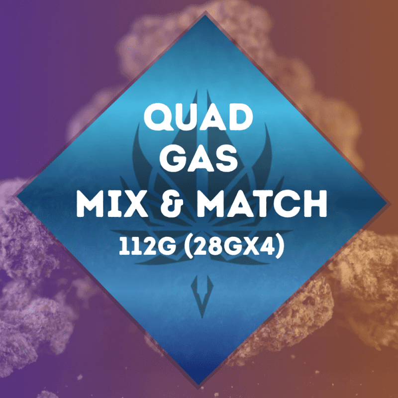 112G QUAD GAS MIX & MATCH (28GX4) – Dive into 112 grams of premium potency with our Quad Gas Mix & Match (28g x 4) – hand-selected from our AAAA- to AAAA+ gas lineup. This bundle is built for the true gas heads who crave loud terp profiles, deep purple hues, and knockout effects. Featuring four 28g options of your choice from our Quad Gas category, expect nothing but heavy hitters with legendary pink lineage, dense structure, and high-octane flavour. Only the finest makes the cut.