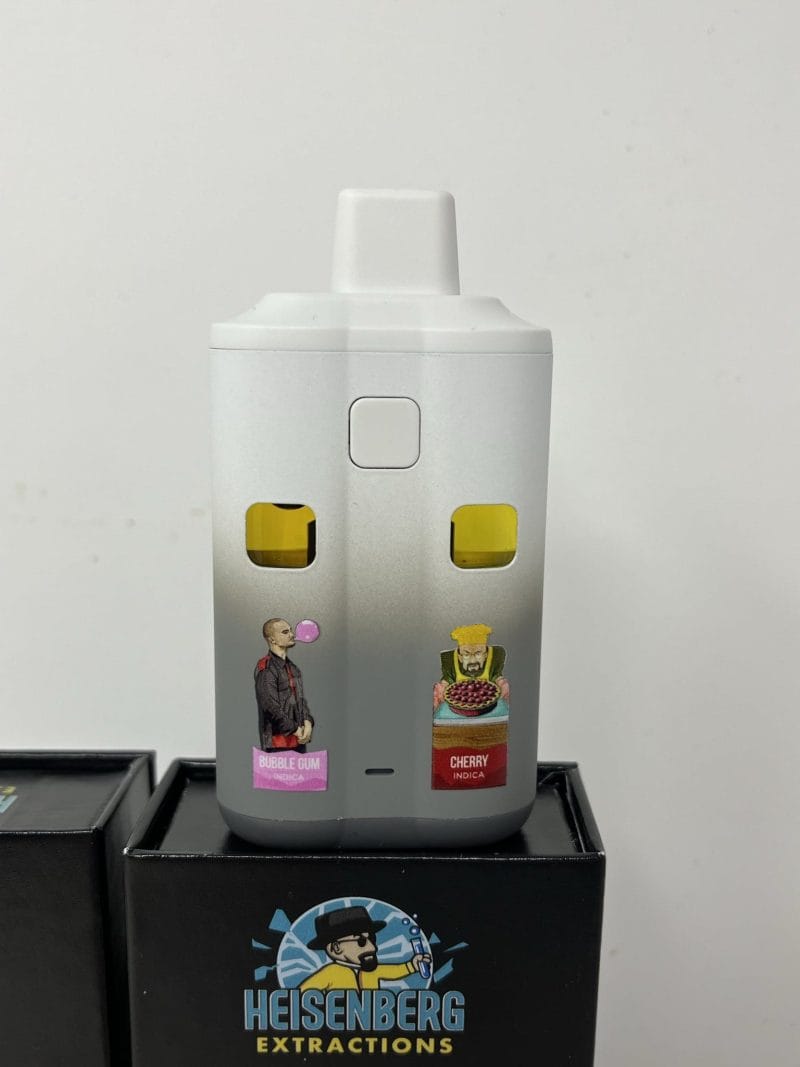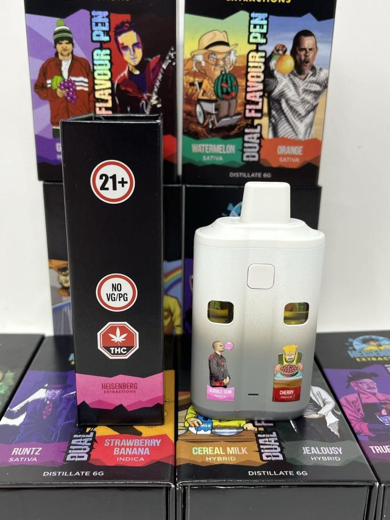 The Heisenberg 6G Distillate Pen is a vaporizer device containing a substantial 6 grams of THC distillate. A unique feature of this product is its dual chamber technology, allowing users to enjoy two distinct flavors within a single device. With 3 grams of each flavor, consumers have the flexibility to switch between tastes by simply adjusting the mouthpiece.