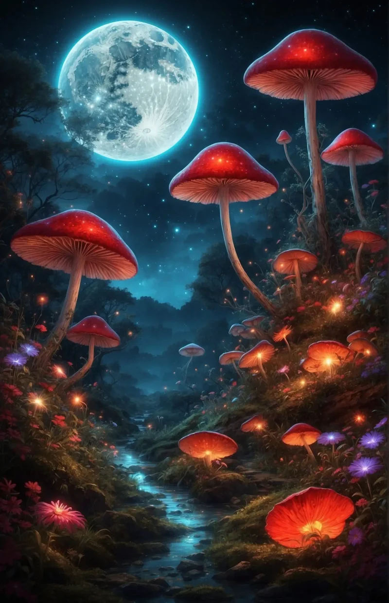 Mushroom Night Forest Poster – Printed on high quality thick photo paper, 11×17 inches.