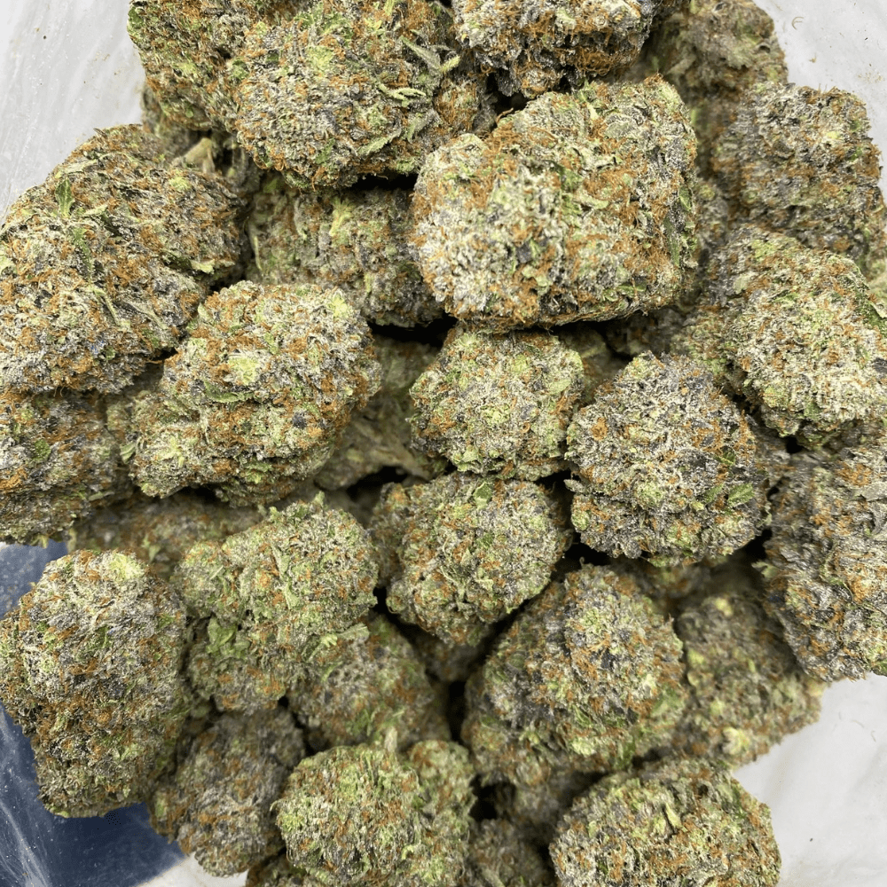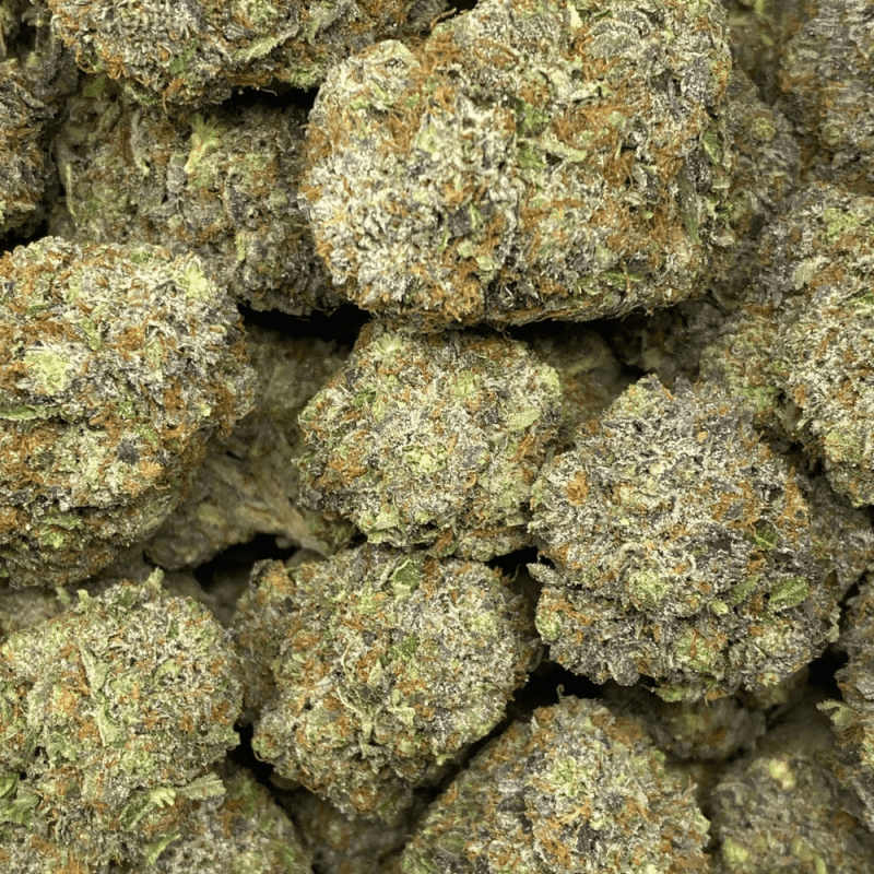 Pink Gargoyle is a potent indica-dominant strain bred from classic Pink Kush genetics, delivering deep sedation and full-body relaxation. When cracked open, users will be hit with a loud burst of pink gas, earthy musk, and sweet herbal notes. This batch showcases chunky, medium-sized buds with a dense structure and heavy trichome coverage, mixing deep forest greens with rich purples and prominent fiery orange pistils. Known for its strong couch-lock effects, Pink Gargoyle is best suited for nighttime use and ideal for those seeking potent relief from stress or insomnia.